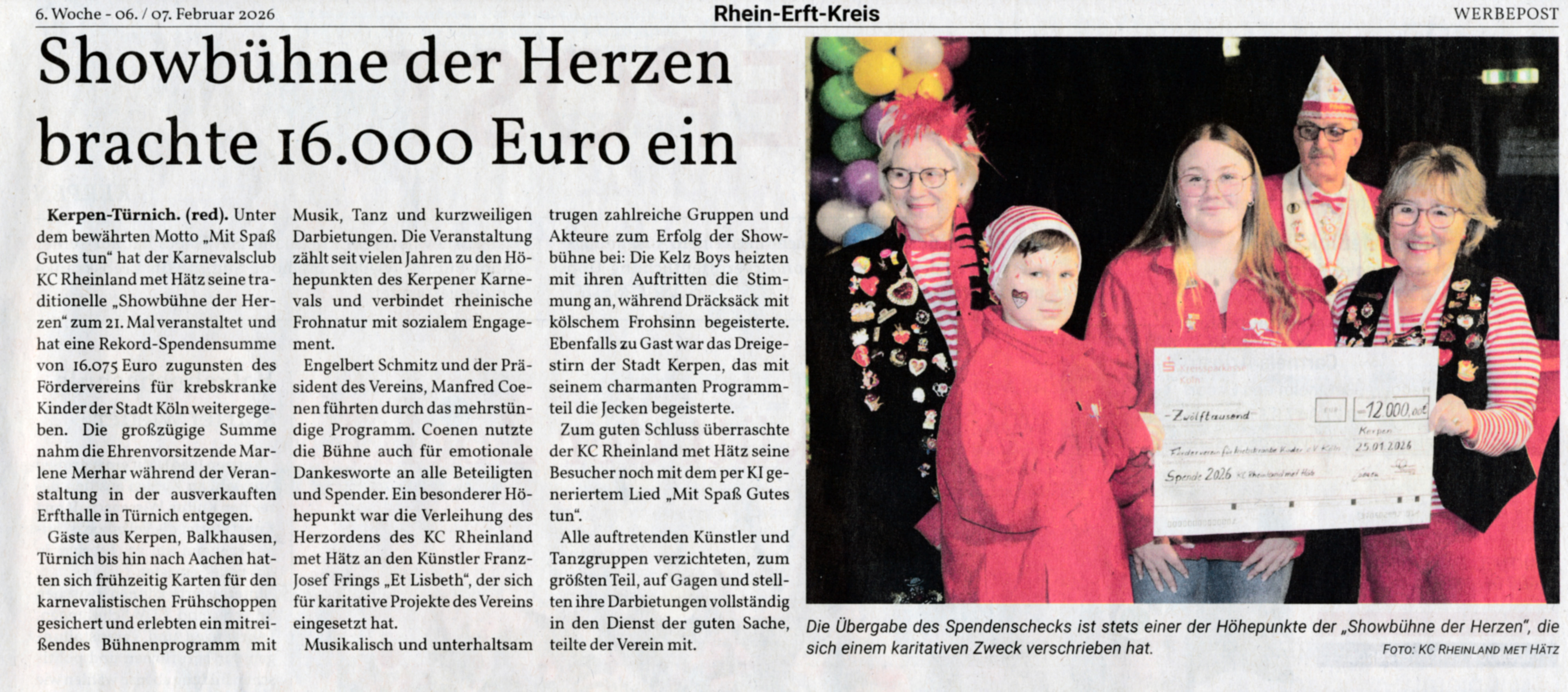 Aktuelles / Pressearchive der KC Rheinland met Hätz Aktuelles "Showbühne 2026" "Showbühne 2026" "Sommerfest 2025" "Sommerfest 2025" "Maibaum für guten Zweck versteigert" "Maibaum zugunsten kranker Kinder versteigert" "Spaß und Gutes brachten 10.000 EURO an Spenden" "Fünf Stunden für den Guten Zweck" "KC Rheinland met Hätz engagiert sich seit 25 Jahren sozial" "Rheinland met Hätz lädt zum Sommerfest" "Karnevalisten zeigten wieder ganz viel Herz" "Herzorden für Herzenssache" "Kerpiswelt Kerpen ist in Kerpen" "Presse Werbepost 19. Showbühne der Herzen 02/2024" "Presse KStA 19. Showbühne der Herzen 21.01.2024" "44 Jahre Festkomtee Kerpen" "Ankündigung 19. Showbüne der Herzen am 21.01.2024" "19. Showbüne der Herzen am 21.01.2024" "Besuch im Elternhaus am 07.10.2023" "Hallo Freunde des KC Rheinland met Hätz! Unterstütze uns indem du hier für KC Rheinland met Hätz abstimmst." "20 Jahre Unterstützung von „KC Rheinland met Hätz“" "KC Rheinland met Hätz spendet 7.600 Euro“" "Bewerbung beim PSD VereinsPreis 2023" "Endlich wieder im Elternhaus: Mitgliederversammlung 2023" "SCHÜTZEN HELFEN" "Kerpen gelingt gemeinsam" "Rheinische Anzeigenblätter 19.06.2023" "Presse KStA Haarspende 12.06.2023" "Haare spenden oder schneiden für den guten Zweck " "Auszüge aus dem Sessionsheft 2023 der Großen Knapsacker KG" Rabaue verschenken einen echten Stern an Gerda Dick "Showbühne der Herzen" fällt aus Jahreshauptversammlung 2022 Pressearchiv